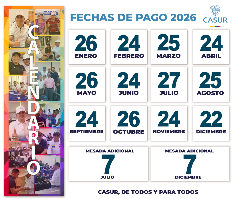 Gracias a la gestion realizada por la direccion de Casur junto con el Ministerio de Hacienda, les compartimos las fechas de pago de las asignaciones y sustituciones mensuales de retiro correspondientes a la vigencia 2025. 📆